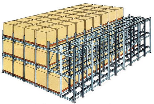 重力式貨架又叫輥道式貨架,屬于倉(cāng)儲(chǔ)貨架中的托盤(pán)類存儲(chǔ)貨架。重力式貨架是橫梁式貨架衍生品之一,貨架結(jié)構(gòu)與橫梁式貨架相似,只是在橫梁上安上滾筒式軌道,軌道呈3-5°傾斜。托盤(pán)貨物用叉車搬運(yùn)至貨架進(jìn)貨口,利用自重,托盤(pán)從進(jìn)口自動(dòng)滑行至另一端的取貨口。重力式貨架屬于先進(jìn)先出的存儲(chǔ)方式。