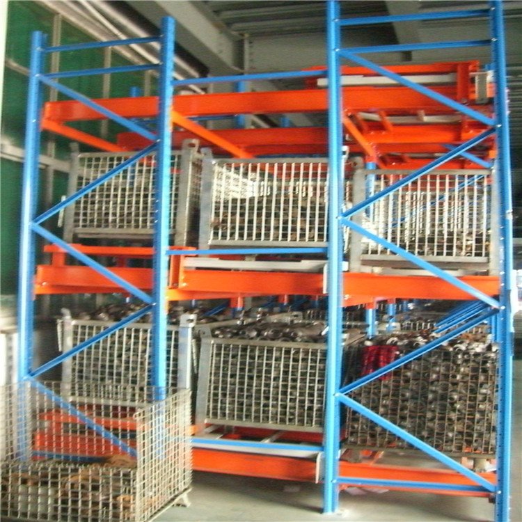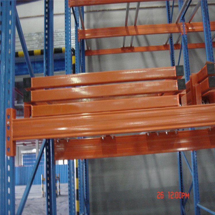 從前推入的貨架:采用軌道和托盤小車相結(jié)合的原理,軌道呈一定的坡度(3°左右),利用貨物的自重,貨物被規(guī)定于單端存儲(chǔ),貨物先進(jìn)后出,適用于大批量少品種的貨物存儲(chǔ),空間利用率很高,存取也較靈活方便。貨架總深度不宜過深,一般在6個(gè)托盤深度以內(nèi),否則由于托盤小車相互嵌入的緣故而會(huì)使空間犧牲較大。單托貨物重量一般在1500kg以內(nèi),貨架高度一般在6m以下。