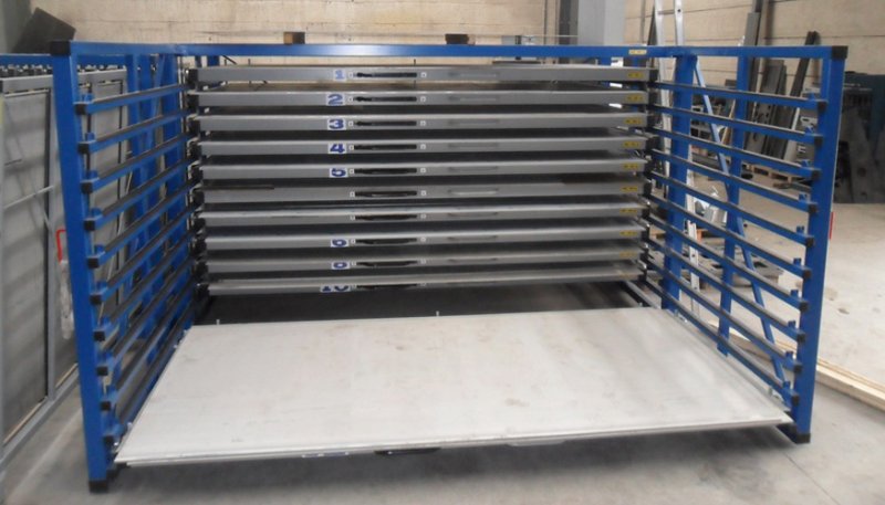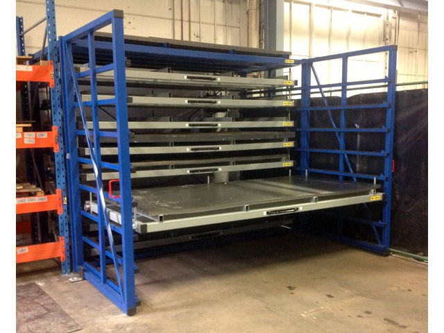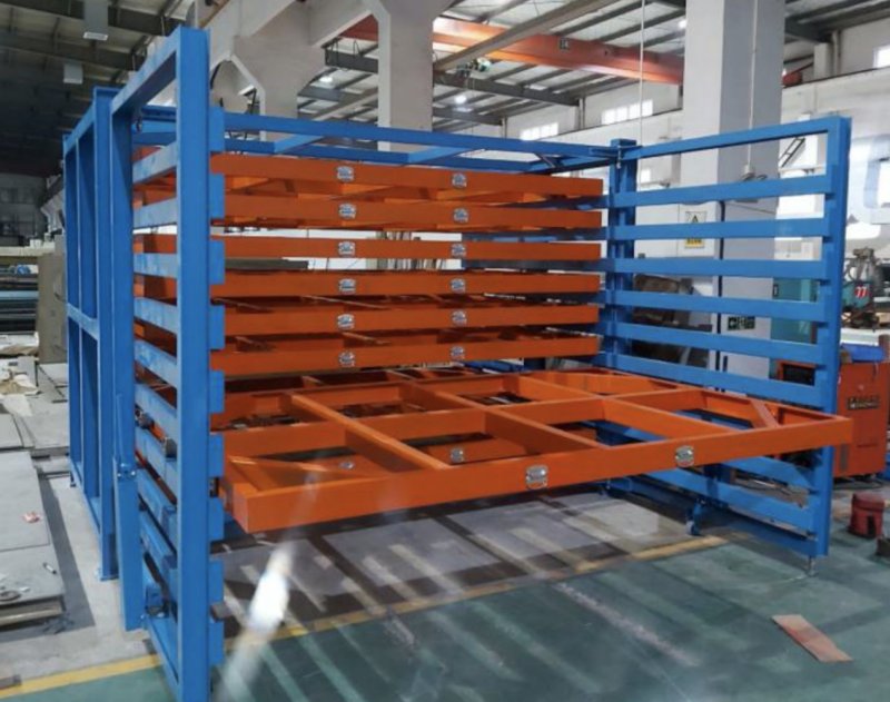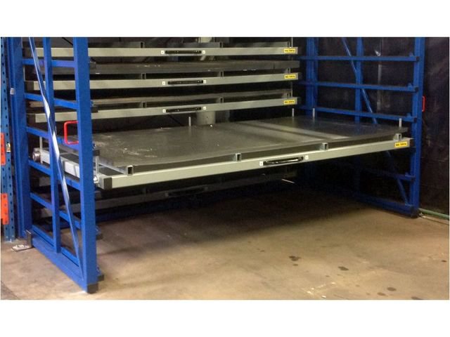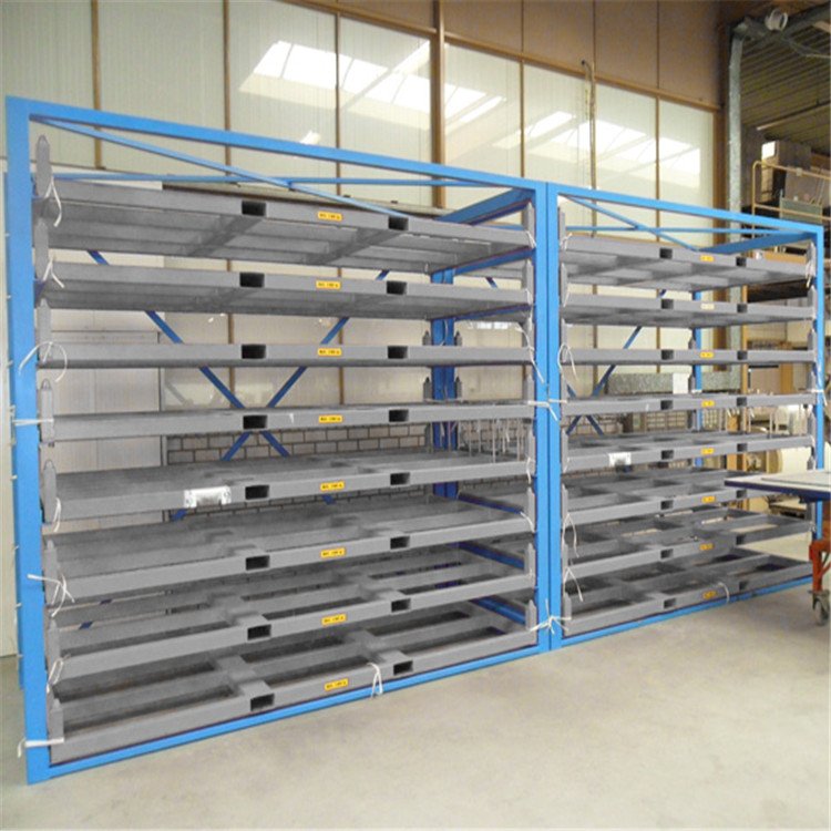 大型板材存放貨架帶有自動(dòng)移動(dòng)框的移動(dòng)式貨架緊湊,方便定位金屬板位置,移動(dòng)框架帶有滑輪和搖臂,選好目標(biāo)板材之后移動(dòng)懸臂即可創(chuàng)造空間獲取板材。移動(dòng)框架固定在兩條平行軌道上,通過移動(dòng)框架,人員方可進(jìn)入空擋獲取金屬板是一種簡(jiǎn)單安全的搬運(yùn)方法。